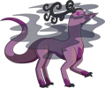 Shadowspewers are quiet, highly territorial creatures. Getting too close to one in the wild—whether aware of its presence or not—is a sure way to get caught in a thick, shadowy fog. Males tend to be more skittish, but will still readily attack if they feel threatened. While the tendrilous horns are smaller on females, the claws are larger, and they are much less yielding to anything they perceive as an intruder. Their diet is largely comprised of bugs and tubers that they dig out of the ground themselves, but they will seek out different sources of food if they can't find enough of their usual fare. The skin on individuals with more colourful Chromas reflect light rather atypically, despite their typically drab hue.