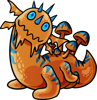 Over time, the mass has formed into a slug-like creature. Its body is still fairly delicate, only able to be outside of water for a few hours at a time. While friendly, it has a habit of nudging people with its spiky head to get their attention. Mushrooms continuously grow on its back, eventually falling off the creature once they’ve grown very large. Its already slow movement is hindered further when there are too many large mushrooms growing on it at once, but severing them is an easy task.