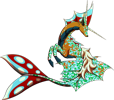 Kelpricorns are aquatic omnivores related to Qidriks and, more distantly, Drakilin. They have vibrant scales which sparkle under the combination of clear waters and a bright sun, and which create a dazzling array of colours to attract mates. Though they normally come in an array of colours, it is unusual but not uncommon to see an individual which bears no colour; these don't survive for very long in the wild. Wild adults are wary of other creatures, and taming one can be extremely difficult; it is therefore easier to raise one from an egg so that it can bond with its handler. In the wild, these creatures form herds of one male and several females; the male defends his harem from predators and rival males. When the herd contains infants and adolescents, the male becomes more aggressive, to protect his offspring. When his sons near adulthood, they leave of their own accord, and are only rarely chased away.