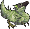 A fluffy mottled-green chick hatched from the egg, and imprinted on the first living thing it saw. It's affectionate to its 'parent' and follows them constantly, but vicious towards everything else, and constantly trying to eat anything that moves.