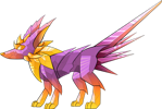 Vullux are curious constructs of living crystal. Resembling foxes in their body structure and behaviour, the nature of their crystalline growths is such that individuals can vary wildly from each other in appearance—one may be covered in spikes, while another may be smoother in appearance or have horns. This crystal is translucent and naturally blue in colour, but adults can be seen in a vibrant array of hues and accent colours, all mimicking known types of gemstone. Vullux make shrill yips when startled or threatened, but can also make a variety of friendlier vocalizations when socializing. They seem easily tamed and are quite social with both handlers and other specimens of their species.