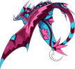 Adorned in an intricate pattern of vibrant colors, the wings of a Razorshriek serve a dual purpose: one, for both sexes to attract equally-colorful mates, and two, to confuse predators attempting to pick one dragon out of a swarm. With their barb-tipped tails also sporting these dazzling colors, a predator which tries to attack a swarm may find itself stung and bitten countless times when it thought it was going for the relatively-unprotected belly of a Razorshriek, making these diminutive predators far more trouble than it's worth to hunt them. Though most wild Razorshrieks are a striking black and white with the only color in their violet markings, it isn't uncommon to see wild adults come in other color variants, which tend to be more vividly colorful; however, the sheer contrast of their standard color scheme seems to help survival by soaking up heat, providing countershading, and making it nearly impossible to stare directly at an active swarm for long periods of time.