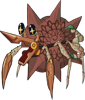 The Long-Nosed Wheel Crab is a bio-mechanical crustacean that is a scavenging omnivore, found in arid climates near bodies of water. It has a symbiotic relationship with a tree-like cycad found along riverbanks in relatively arid climates, known as the Mace Tree. The Mace Tree's heavy, hard-shelled pods can inflict serious injury if they happen to fall on a researcher, but make perfect protective armor and convenient transport for the Wheel Crab, which travels long distances by rolling itself forwards. The spike at the end of this variant's mouth acts as just another spoke of the wheel when it tucks its head in. They reinforce the shells with a lacquer-like secretion, and seeds dislodge and fall from the shell as they roll around, helping the plant spread. Eggs are carried in the mother's humid shell, then the young are deposited into a seed pod that will later become their first shell.