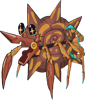 The Long-Nosed Wheel Crab is a bio-mechanical crustacean that is a scavenging omnivore, found in arid climates near bodies of water. It has a symbiotic relationship with a tree-like cycad found along riverbanks in relatively arid climates, known as the Mace Tree. The Mace Tree's heavy, hard-shelled pods can inflict serious injury if they happen to fall on a researcher, but make perfect protective armor and convenient transport for the Wheel Crab, which travels long distances by rolling itself forwards. The spike at the end of this variant's mouth acts as just another spoke of the wheel when it tucks its head in. They reinforce the shells with a lacquer-like secretion, and seeds dislodge and fall from the shell as they roll around, helping the plant spread. Eggs are carried in the mother's humid shell, then the young are deposited into a seed pod that will later become their first shell.