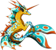 Kelpricorns are aquatic omnivores related to Qidriks and, more distantly, Drakilin. They have vibrant scales which sparkle under the combination of clear waters and a bright sun, and which create a dazzling array of colours to attract mates. Though they normally come in an array of colours, it is unusual but not uncommon to see an individual which bears no colour; these don't survive for very long in the wild. Wild adults are wary of other creatures, and taming one can be extremely difficult; it is therefore easier to raise one from an egg so that it can bond with its handler. In the wild, these creatures form herds of one male and several females; the male defends his harem from predators and rival males. When the herd contains infants and adolescents, the male becomes more aggressive, to protect his offspring. When his sons near adulthood, they leave of their own accord, and are only rarely chased away.