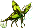 Tyilings are beautiful, rare creatures that lay dormant most of the year and only seem to emerge with the blooming of flowers in the spring, when they then become plentiful. They are incredibly lightweight, able to fly unladen for moderate distances via their large, butterfly-like wings. Close relatives to Qidrik, these deer are fairly calm and docile even when wild, showing little to no fear of predators while they peacefully eat fresh grasses and flower buds. Though their antlers are long, sturdy, and sharp, a Tyiling does not use them for defense-- rather, the antlers connect to the creature's long, drooping antennae, raising them so that the wind will blow them and spread the dust that falls from the long feelers.