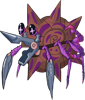 The Long-Nosed Wheel Crab is a bio-mechanical crustacean that is a scavenging omnivore, found in arid climates near bodies of water. It has a symbiotic relationship with a tree-like cycad found along riverbanks in relatively arid climates, known as the Mace Tree. The Mace Tree's heavy, hard-shelled pods can inflict serious injury if they happen to fall on a researcher, but make perfect protective armor and convenient transport for the Wheel Crab, which travels long distances by rolling itself forwards. The spike at the end of this variant's mouth acts as just another spoke of the wheel when it tucks its head in. They reinforce the shells with a lacquer-like secretion, and seeds dislodge and fall from the shell as they roll around, helping the plant spread. Eggs are carried in the mother's humid shell, then the young are deposited into a seed pod that will later become their first shell.