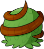 This round, leafy egg is much heavier than its size lets on. It has what appears to be a thick vine or root coiled around it.