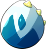 A large, white egg with a curious blue marking on the bottom. There are hard, smooth bumps on the shell, golden in colour. The entire egg is very light for its size and almost feels hollow to a casual handler.