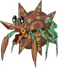 The Long-Nosed Wheel Crab is a bio-mechanical crustacean that is a scavenging omnivore, found in arid climates near bodies of water. It has a symbiotic relationship with a tree-like cycad found along riverbanks in relatively arid climates, known as the Mace Tree. The Mace Tree's heavy, hard-shelled pods can inflict serious injury if they happen to fall on a researcher, but make perfect protective armor and convenient transport for the Wheel Crab, which travels long distances by rolling itself forwards. The spike at the end of this variant's mouth acts as just another spoke of the wheel when it tucks its head in. They reinforce the shells with a lacquer-like secretion, and seeds dislodge and fall from the shell as they roll around, helping the plant spread. Eggs are carried in the mother's humid shell, then the young are deposited into a seed pod that will later become their first shell.