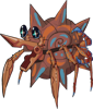 The Long-Nosed Wheel Crab is a bio-mechanical crustacean that is a scavenging omnivore, found in arid climates near bodies of water. It has a symbiotic relationship with a tree-like cycad found along riverbanks in relatively arid climates, known as the Mace Tree. The Mace Tree's heavy, hard-shelled pods can inflict serious injury if they happen to fall on a researcher, but make perfect protective armor and convenient transport for the Wheel Crab, which travels long distances by rolling itself forwards. The spike at the end of this variant's mouth acts as just another spoke of the wheel when it tucks its head in. They reinforce the shells with a lacquer-like secretion, and seeds dislodge and fall from the shell as they roll around, helping the plant spread. Eggs are carried in the mother's humid shell, then the young are deposited into a seed pod that will later become their first shell.