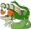 In the wild Demon Weeds are often observed fighting Knuttes, with the former attempting to protect their territory and the latter merely being enticed by the prospect of eating a large, juicy fruit. Due to the two being relatively similar in size, these fights are more a matter of survival than one genuinely attempting to eat the other. While they won't eat any Knutte they ensnare, they will ensure that they, at the very least, are gravely wounded and will think twice before attempting to disturb them again. Curiously, Demon Weeds in captivity are very easy to tame and will readily respond to commands if one makes the effort to train them. They're quite good at knowing better than to try and bite the hand that feeds them.