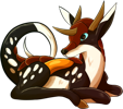 This deer fawn has three small horns and smooth, scale-like plates growing on its back, as well as ridged sacs just behind its shoulder blades. It's very calm, and there's a faintly floral scent around it that makes one want to be near it.