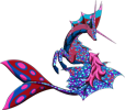 Kelpricorns are aquatic omnivores related to Qidriks and, more distantly, Drakilin. They have vibrant scales which sparkle under the combination of clear waters and a bright sun, and which create a dazzling array of colours to attract mates. Though they normally come in an array of colours, it is unusual but not uncommon to see an individual which bears no colour; these don't survive for very long in the wild. Wild adults are wary of other creatures, and taming one can be extremely difficult; it is therefore easier to raise one from an egg so that it can bond with its handler. In the wild, these creatures form herds of one male and several females; the male defends his harem from predators and rival males. When the herd contains infants and adolescents, the male becomes more aggressive, to protect his offspring. When his sons near adulthood, they leave of their own accord, and are only rarely chased away.