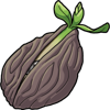 This resembles a large seed, with a leafy plant beginning to sprout from it, but every so often, you can see an eye peering out of the gap in the tough seed coating.