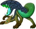 The Dontorex is a frightful, chimeric therapsid and an aggressive predator. A known maneater, it is one of many reasons why exploration of Crop Circle Canyon was delayed. Dontorexes are highly solitary, coming together only to mate and then going their separate ways; a non-mating encounter between two adults is a violent affair. The gaping jaws on their tails allow them to swallow prey much larger than they would normally seem to be able to; much like a snake's, these jaws can unhinge to accommodate for wider animals. Though large prey can make a Dontorex's stomach distended, the acid found in their digestive tract dissolves everything in mere hours. It typically swallows its prey alive and whole.