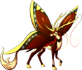 Tyilings are beautiful, rare creatures that lay dormant most of the year and only seem to emerge with the blooming of flowers in the spring, when they then become plentiful. They are incredibly lightweight, able to fly unladen for moderate distances via their large, butterfly-like wings. Close relatives to Qidrik, these deer are fairly calm and docile even when wild, showing little to no fear of predators while they peacefully eat fresh grasses and flower buds. Though their antlers are long, sturdy, and sharp, a Tyiling does not use them for defense-- rather, the antlers connect to the creature's long, drooping antennae, raising them so that the wind will blow them and spread the dust that falls from the long feelers.